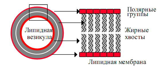 В водном растворе молекулы фосфолипидов самопроизвольно собираются и образуют двойной слой (бислой), при этом гидрофильные головы располагаются на обращенных к воде поверхностях, а гидрофобные хвосты направлены друг к другу и вытесняют из внутренней области молекулы воды. Толщина липидного бислоя составляет примерно 4-5 нм (рис. 2).