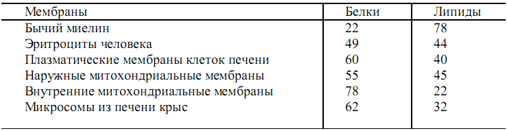 В табл. 1 приведено относительное содержание белков и липидов в некоторых мембранах. Грубо говоря, по массе мембраны состоят наполовину из белков, наполовину - из липидов, но во внутриклеточных мембранах, содержащих переносчики электронов (внутренние мембраны митохондрий, мембраны микросом), белков существенно больше, чем липидов. На долю углеводов может приходиться около 10 % массы мембран, они всегда входят в состав гликолипидов и гликопротеидов.