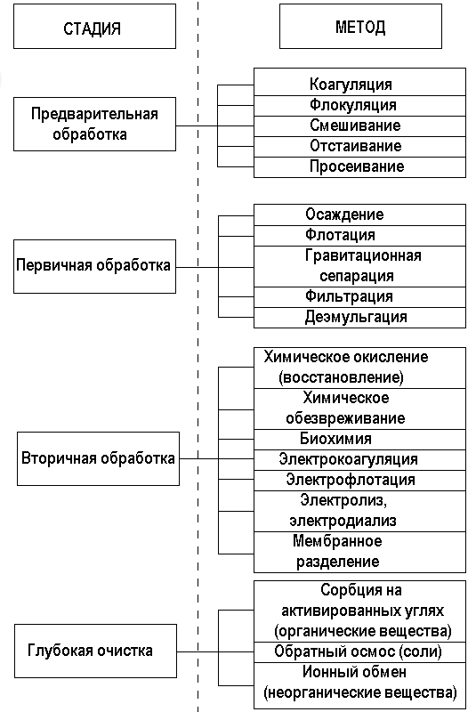 Процесс очистки сточных вод производственного предприятия, как правило, включает несколько стадий, на каждой из которых возможно применение различные методов очистки сточных вод и соответствующего технологического оборудования. Данная ситуация обусловлена в первую очередь тем, что многие методы, в особенности тонкой очистки сточных вод нельзя использовать, если в них присутствуют взвешенные вещества и эмульсии. Кроме этого, большинство методов очистки стоков имеет верхний предел концентраций по загрязняющим веществам, от которых данный метод должен очищать сток. Следовательно возникает необходимость предварительной обработки стоков перед применением основных методов их очистки. Применение стадийной очистки сточных вод промышленных предприятий обусловлено также тем, что комбинированием нескольких типов процессов обработки возможно достигнуть требуемой степени очистки с минимальными затратами.