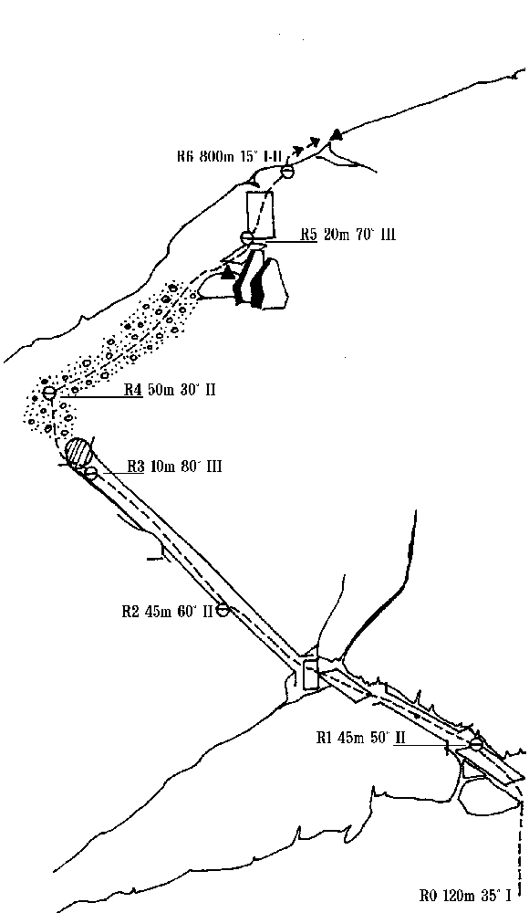 обход пробки 10 м. 80град III- кат. сл. по каменной осыпи вверх 40-50 м. 30град I–II кат. сл. Летом пробку лучше обходить слева, зимой залитая льдом пробка обходится справа по ходу. Под пробкой контрольный тур 2. |