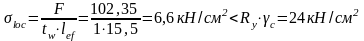 где F = 2·20,47·5/2 =102,35 кН – опорные реакции балок настила; lef = b +2tf = 11,5 +2·2= = 15,5 см – длина передачи нагрузки на стенку балки.