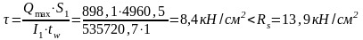 Проверяем максимальное касательное напряжение в стенке на опоре балки