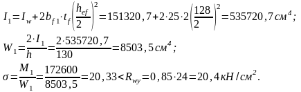 Принимаем пояс 250×20 мм Af1 = 50 см2. Принятое сечение пояса удовлетворяет рекомендациям bf1˃18 см и bf1˃h/10 = 130/10 =13 см.