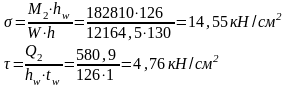 Проверяем максимальные нормальные напряжения в поясах в середине балки