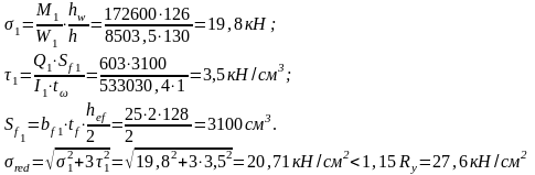 Проверяем приведенные напряжения в месте изменения сечения балки