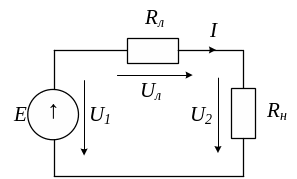 Сопротивление RЛ включает в себя сопротивления проводов линии (R6, R7 на рис.1.14), поэтому падение напряжения UЛ складывается из падений напряжения на R6 и R7. Очевидно, что