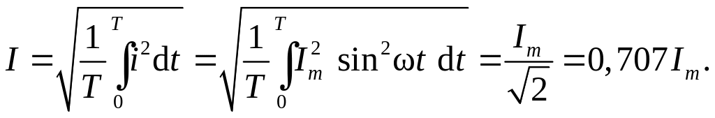 Для характеристики гармонического тока применяется понятие действующего значения (его называют также эффективным или среднеквадратичным). Под действующим значением тока I понимается постоянный ток, который оказывает такое же тепловое действие при прохождении через активное сопротивление, что и переменный ток: