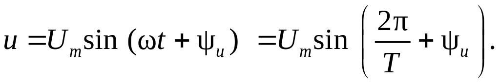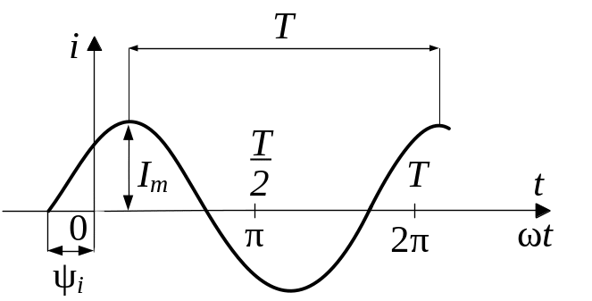 Максимальное значение функции Im называют амплитудой тока; T − период изменения тока; ψi − начальная фаза тока. Частота тока − число колебаний за одну секунду: f=1/T, 1/с (Гц). Величину ω =2π/T называют угловой частотой и измеряют в рад./с. Аргумент синусоидальной функции (ωt + ψi) называют фазой. Текущее значение i называют мгновенным значением тока.
