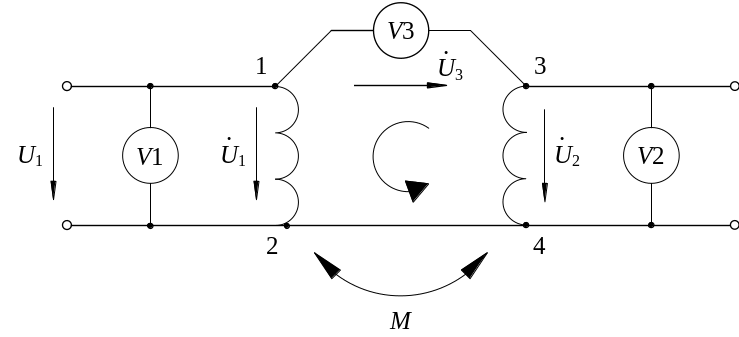 Если наше предположение по поводу направления напряжения U2 верно, то показание вольтметра V3 будет равно разности показаний вольтметров V1 и V2. А это, в свою очередь, означает, что напряжение взаимоиндукции U2 во второй обмотке направлено так же, как и напряжение самоиндукции U1 (и ток) первой обмотки. Тогда одноименными зажимами являются 1,3 или 2,4.