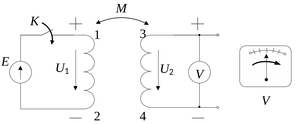 На практике часто применяют еще один способ определения одноименных зажимов с использованием источника и вольтметра постоянного тока. Индуктивно-связанные катушки включают по схеме рис. 4.7,а.