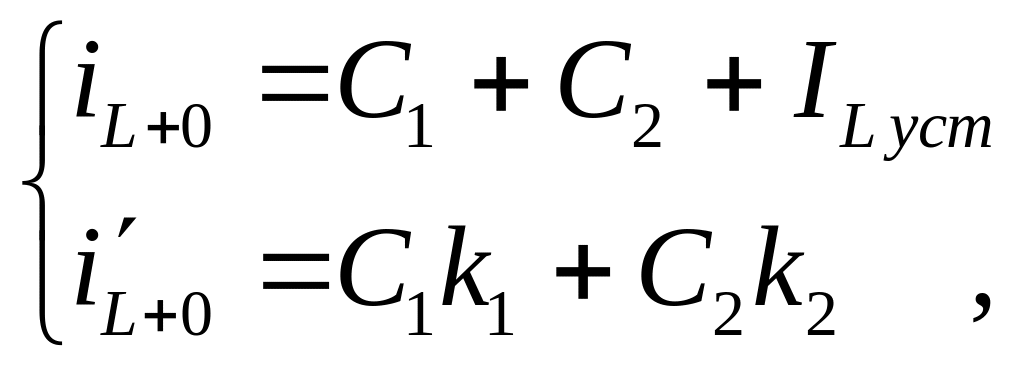 Для определения произвольных постоянных C1 и C2 необходимо знать начальные значения тока iL(t+0)= iL+0 и его производной i′L(t+0)= i′L+0 . Их определение рассмотрим дальше на примере решения конкретных задач, а сейчас полагаем их известными. Тогда для определения произвольных постоянных C1 и C2 следует составить два уравнения для момента времени t= t+0=0. Составим их для случая вещественных и разных корней k1≠ k2.