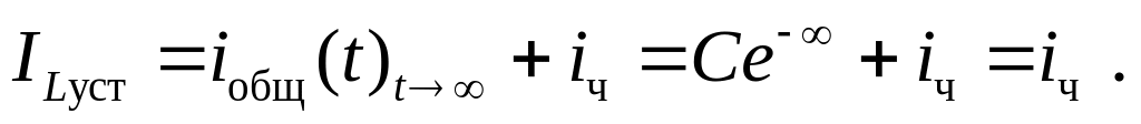 Применительно к переходным процессам в электрических цепях в качестве частного решения принимают установившееся значение рассматриваемой переменной, в данном случае − ток ILуст в индуктивности. Действительно, математическим условием достижения установившегося режима является требование t→∞. Поскольку выражение (6.6) дает величину тока в любой момент времени после коммутации, в том числе и в установившемся режиме, то, подставляя (6.8) в (6.6) и полагая t→∞, получим: