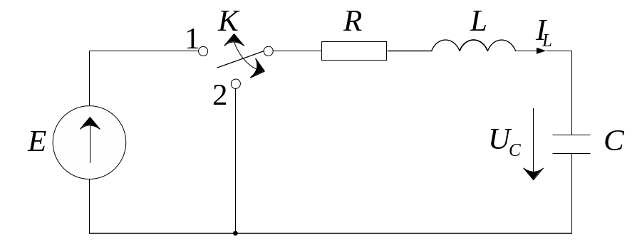 На рис. 6.2 представлена цепь второго порядка, содержащая активное сопротивление R, индуктивность L и емкость С. Ключ К имеет два положения: 1 − цепь подключена к источнику E, и 2 − цепь отключена от источника и замкнута накоротко перемычкой. Процесс коммутации заключается в переключении ключа К из одного положения в другое.