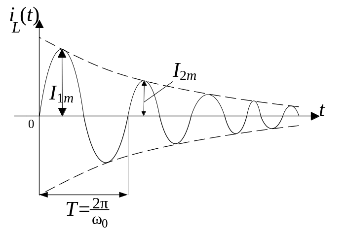 Кривая тока представляет собой затухающую синусоиду с периодом T=2π/ω0. Величина ω0 носит название частоты свободных колебаний.