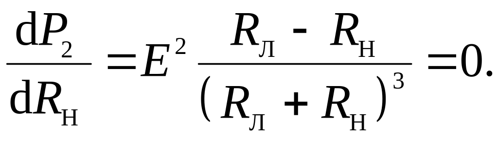 Как в режиме холостого хода, так и в режиме короткого замыкания P2=0. Из этого следует очевидный вывод о том, что функция P2(I) имеет по крайней мере один максимум в диапазоне изменения тока (0, Iкз). Для его определения следует взять производную от P2 по току и приравнять ее нулю. А поскольку ток I является функцией сопротивления нагрузки, то производную следует взять по RН: