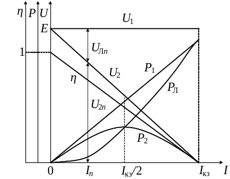 Мощность P1 = EI, отдаваемая источником, линейно зависит от тока, а мощность, выделяющаяся в линии, PЛ = RНI 2 изменяется по квадратичному закону. Мощность PЛ представляет собой потери, поэтому всегда стремятся к снижению ее величины.