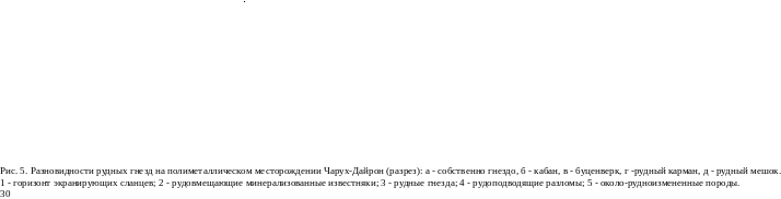 В ряде случаев среди рудных гнезд в зависимости от деталей их строения выделяют ряд разновидностей (рис. 5): собственно гнезда - т.е. это абсолютно изометричные рудные тела; кабаны - это слегка вытянутые по горизонтали рудные гнезда; буценверки - вертикально ориентированные; рудные карманы, это рудные гнезда, имеющие карманообразную форму, а в случае рудного мешка - мешкообразную. Если рудные выделения имеют еще меньшие размеры, то возможно выделение таких форм как рудные почки и рудные чечевицы (желваки), которые по Д.И. Соколову соответственно определяются "величиной с человеческую голову" и "величиной с кулак". Рудные шлиры -это выделения полезных ископаемых тех же размеров, что и почки и желваки, но не имеющие резких контактов с вмещающими породами.