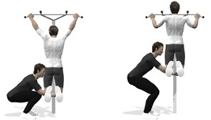 Эта методика актуальна в основном для тех, кто не может подтянуться вообще или подтягивается 5 раз или меньше. Как вы уже, наверное, догадались, суть её в том, что партнёр берёт вас руками за голени и подталкивает вверх. Если человек может подтянуться всего 1 раз, то при такой помощи у него получится сделать это раз 6.