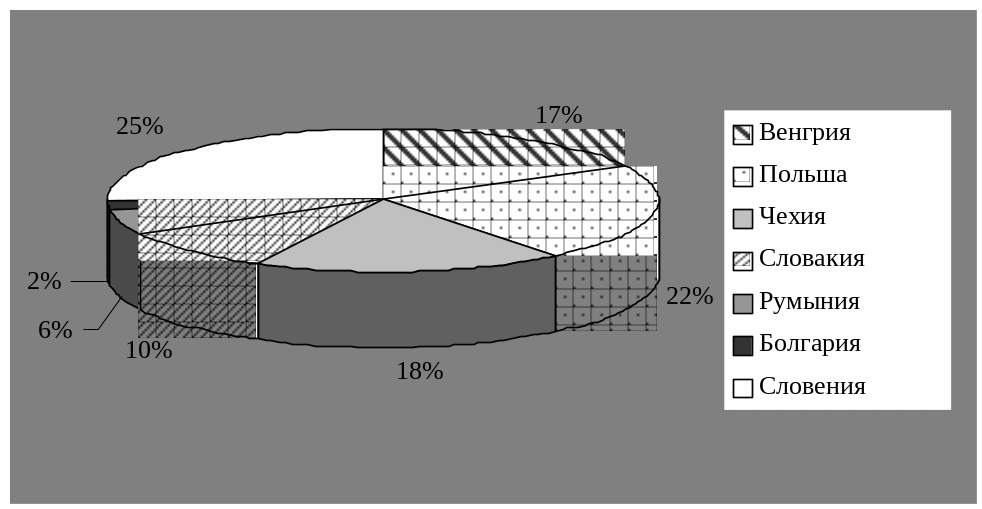 Рисунок 6 - Доля отдельных государств в совокупном объеме туристских потоков постсоциалистических стран Европы (кроме России и стран ближнего зарубежья), % [7]