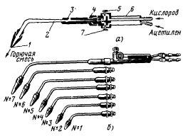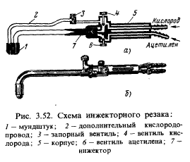 Газовые резаки. Для кислородной резки ацетиленом используют оборудование для ацетиленовой сварки, но вместо сварочной горелки применяют инжекторные резаки Р-2А (МАЯК 2А-02) и вставные резакиРВ-1А (РГМ-70) и РВ-2А (РГС-70) (рис. 3.52).Вставные резаки присоединяют к стволугорелки вместо сменного наконечника.