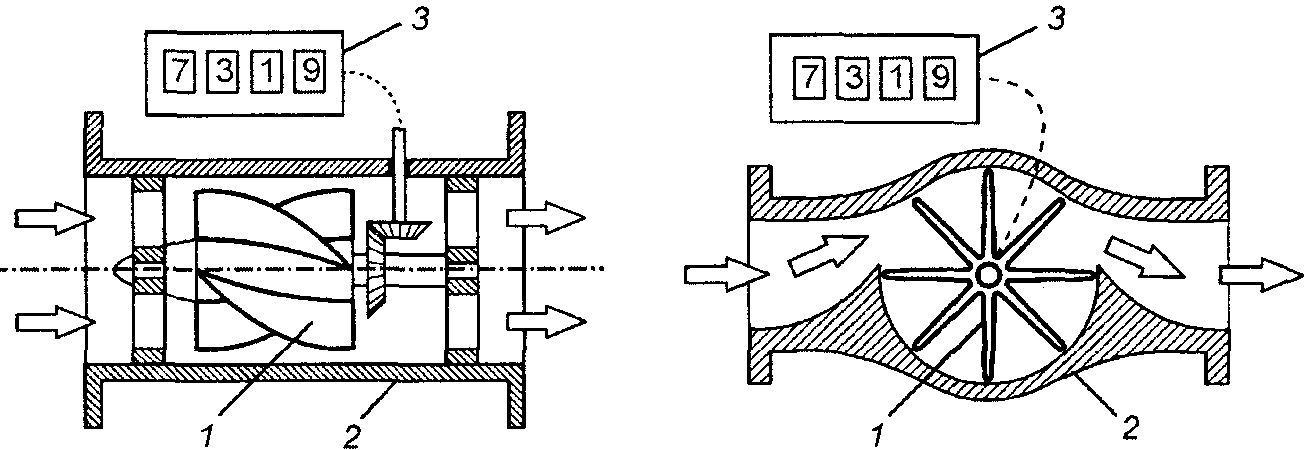 Рис. 5.2. Счетчик с турбинкой, расположенной тангенциально к потоку: / — турбинка; 2 — корпус; 3 — счетчик