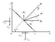 Еңкіш ВС ауданындағы кернеулерді анықтайық (13.1 – сурет). Осы еңкіш алаңдағы нормаль х осімен α бұрышын құрсын. Кубтың ОВ және ОС қабырғаларында σ11 және σ22 нормальды кернеулері және σ12 жанама кернеуі түсірілген. Бағыттаушы косинустар мынаған тең: n1 = cosα; n2 = sinα; n3 = 0.