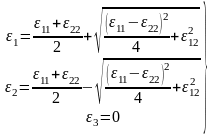 Осы тензорлардың басты сыңарлары үшінші дәрежелі теңдіктерді шешу арқылы анықталады. Жазық деформация болған кезде басты деформацияның біреуі нөльге тең болады. Сондықтан үшінші дәрежелі теңдеулер екінші дәрежесі бар мынандай теңдеулерге айналады: