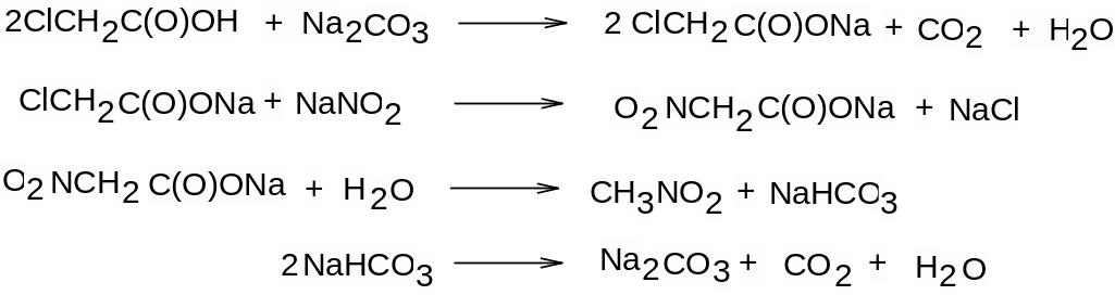 Спочатку одержують сіль хлороцтової кислоти, потім до отриманої солі додають теоретично розраховану кількість нітриту Натрію. При нагріванні утвориться нітрометан. Вихід нітрометана становить 50% від теоретичного (за хлороцтовою кислотою). Було висловлене припущення, що причиною невисокого виходу є розкладання нітрометану бікарбонатом, що утворюється на третій стадії. Тому гідроксид Натрію замінювали на гашене вапно або свіжоосаджений карбонат Кальцію, для того щоб одержати за реакцією замість розчинного у воді бікарбонату Натрію нерозчинний карбонат Кальцію. Однак виявилося, що вихід від цього не підвищився; але все ж таки цей спосіб є більш вигідним для виробництва (крейда дешевше гідроксиду Натрію).