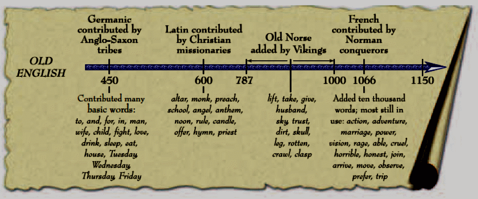 The most valuable characteristic of Old English, however, was its ability to change and grow, to adopt new words as the need arose. While Christianity brought Latin words such as cloister, priest, and candle into the Anglo-Saxon vocabulary, encounters with the Vikings brought skull, die, crawl, and rotten. The arrival of the Normans in 1066 would stretch the language even farther, with thousands of words from the French.