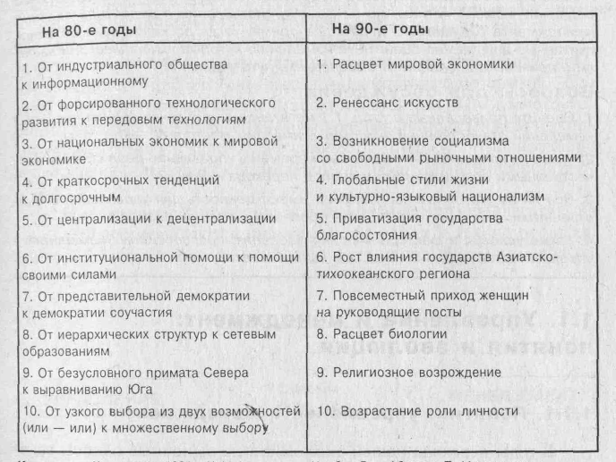 Радикальные изменения, происходящие под воздействием научно-технической революции во второй половине XX в., привели к реальному переходу к постиндустриальной (или информационной) стадии общественного развития. Этот процесс, охватывающий все большее число стран и даже континентов, отражается на самых разных сторонах жизни общества и в том числе на организации управления. Поэтому ознакомление с прогнозами, в которых рассматриваются мегатенденции мирового развития и выделяются главные направления ожидаемых преобразований, может оказать реальную помощь менеджерам организаций. Один из таких прогнозов составлен американскими учеными на два последних десятилетия XX в. (табл. 1.1)