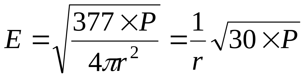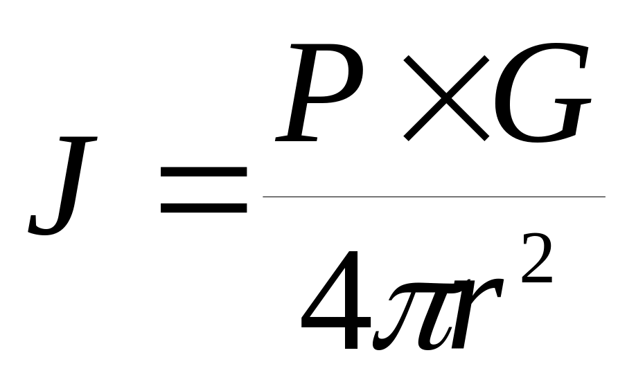 Практически плотность потока энергии J (Вт/м2) в зависимости от расстояния r (м) до излучателя в воздухе определяется через мощность излучения радиотехнического устройства P (Вт) и коэффициент усиления излучающей антенны G: