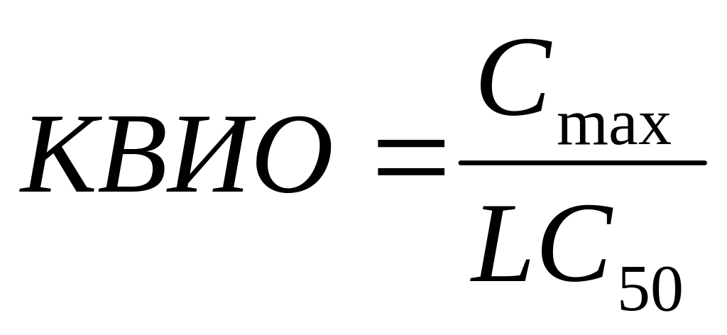Эта классификация учитывает значения допустимых концентраций в воздухе при 20оС, размеры зон острого и хронического действия, коэффициент возможности ингаляционного отравления (КВИО). КВИО - отношение максимально достижимой концентрации вредного вещества в воздухе при 20оС к средней смертельной концентрации для мышей (ГОСТ 12.1.007-76).