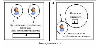 Наличие зоны временного пребывания реализует метод защиты временем. Разнесение зоны постоянного пребывания и источника опасности реализует метод защиты расстоянием.