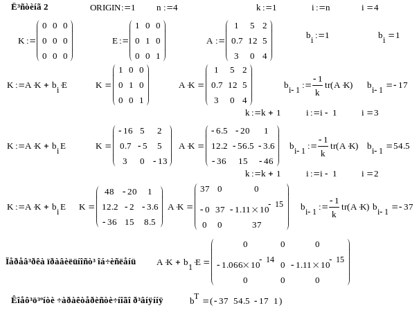 Ілюстрація алгоритму розв’язання задачі методом Фадєєва-Левер’є за допомогою програми Mathcad наведено на лістингу 2
