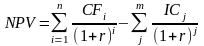 CFі – дохід (прибуток) і-го періоду, грн; ІСj – інвестиції j-го періоду, грн; r – ставка дисконтування; n – період життєвого циклу інвестиційного проекту; |