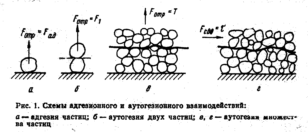 Рис. 1 Схеми адгезійної та аутогезійної взаємодії часток пилу