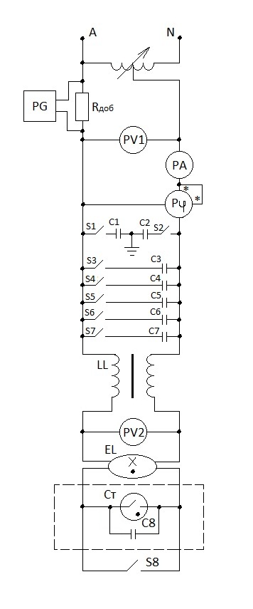 2.2.8 Встановити напругу 220 В і підібрати таку комбінацію ємностей, при якій струм буде мати найменше значення. Виконати вимірювання за п.2.2.5 (крім вимірювання освітленості).