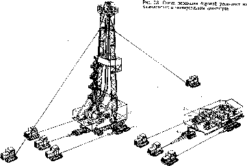 Как уже было сказано, благодаря применению мелких и крупных блоков, быстросъемных соединений, элементов линий высокого давления от буровых насосов, воздушных трубопроводов, при передаче мощности карданными валами, при которых исключается необходимость точного центрирования механизмов и агрегатов, а также при возможности перевозки блока с поднятой вышкой монтаж установки на новой точке производится в течение 1—3 дней.