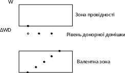 тобто α < 0, що відповідає зменшенню R при збільшенні Т і має різне значення при різних температурах. Провідність, зумовлена електронами, називається електронною (n- тип), а дірками - діркового (р- тип). В напівпровідниках, у яких відсутні домішки і дефекти кристалічної ґратки, провідність є електронно-дірковою. Вона називається власною і досягає значних величин при достатньо високих температурах. При введенні до кристала домішок або порушенні періодичності його кристалічної гратки енергетична зонна діаграма змінюється. Якщо валентність атомів домішки на одиницю більша від валентності основних атомів кристалу, то один валентний електрон домішкового атома не буде брати участі у створенні ковалентних зв'язків і, відокремившись від атома за рахунок теплового руху, стає електроном провідності. Дірка, яка виникає на місці вивільненого електрона, є зв'язаною з домішковим атомом і не зможе вільно переміщуватись в кристалі. Домішки, які дають напівпровіднику вільні електрони провідності, називаються донорами. Енергетичні рівні таких електронів називаються локальними, бо вони виникають не по всьому кристалу, а тільки там, де є домішкові атоми. Локальні рівні в напівпровідниках з донорними домішками розташовані в зоні заборонених енергій поблизу нижнього рівня зони провідності (рис. 4). З цих рівнів електрони легко переходять в зону провідності, оскільки енергія активації донорної домішки ΔWD значно менша енергії активації ΔW власної провідності. Завдяки цьому концентрація домішкових носіїв струму при незначних температурах значно перевищує концентрацію власних носіїв, внаслідок чого в напівпровідниках з донорними домішками переважає електронна провідність.