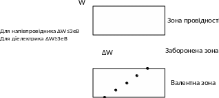 Електричні властивості кристалічних твердих тіл визначаються будовою їхньої кристалічної ґратки і характером сил, що діють між частинками твердого тіла, тобто типом хімічного зв'язку. За квантовою теорією енергія електронів в атомах квантується, тобто може мати лише дискретні значення. Ці значення енергії відповідають енергетичним рівням. Якщо однакові атоми ізольовані один від одного, то вони мають однакові енергетичні рівні. При утворенні кристала відбувається зміна енергетичних рівнів у зв'язку з взаємодією атомів. Якщо кристал складається з N атомів, то замість одного, однакового для всіх атомів рівня, виникає N дуже близьких енергетичних рівнів, які не співпадають один з одним і сукупність яких називається зоною енергетичних рівнів. Розщеплення енергетичних рівнів відбувається згідно з принципом Паулі, за яким на одному енергетичному рівні може перебувати не більше двох електронів, які відрізняються орієнтацією спінів. Сукупність значень енергії, якими можуть мати електрони в даному атомі (зони дозволених енергій) чергуються зі значеннями енергій, які електрони в даному атомі мати не можуть (зони заборонених енергій). Ступінь розщеплення для різних рівнів неоднакова. Рівні, заповнені ближчими до ядра (внутрішніми) електронами, розщеплюються незначно, бо ці електрони слабо взаємодіють з електронами і ядрами інших атомів, які утворюють кристал. Така взаємодія є значною для валентних електронів, внаслідок чого їхні рівні розщеплюються сильніше, створюючи валентну зону. Ще помітнішим є розщеплення більш високих, ніж валентні, енергетичних рівнів, не зайнятих електронами в основному стані атома. У кристалів різних типів ступінь заповнення валентної зони різна і енергетичні зони розміщені по-різному, чим пояснюється їхня різна електропровідність. Кристали, у яких валентна зона заповнена повністю, а наступна за нею зона дозволених енергій відокремлена зоною заборонених енергій, при абсолютному нулі температури і відсутності зовнішнього збудження (підігрів, опромінення) провідності не мають. В таких кристалах електричне поле не може викликати напрямленого переміщення електронів, оскільки при напруженостях поля, які не викликають пробою кристалів, воно не може надати електронам необхідної для цього енергії. Цю додаткову енергію електрони можуть одержати при нагріванні, опроміненні та інших збудженнях кристала. Якщо внаслідок цього енергія електрона виявиться достатньою для переходу його до вільної зони дозволених енергій, яка називається зоною провідності, то в кристалі є можливим виникнення електричного струму, а такі речовини називаються напівпровідниками. Якщо заборонена зона настільки широка, що перехід електронів є неможливим, то речовина є ізолятором (діелектриком). Умовно вважають, що напівпровідниками є речовини з шириною забороненої зони менше 3 еВ, а діелектриками – кристали з шириною забороненої зони більше 3 еВ (рис. 1). Енергія ΔW, необхідна для переведення електрона в зону провідності, називається енергією ширини забороненої зони або енергією активації електронів. Чисельно енергія активації співпадає з шириною забороненої зони.