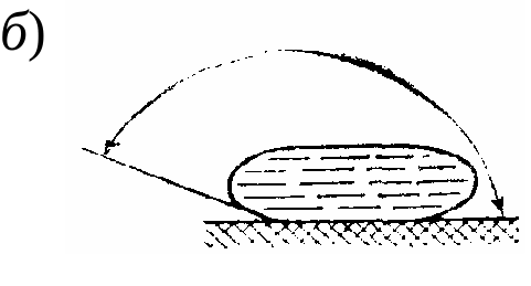 Рисунок 24 - Капля жидкости на смачиваемой поверхности диэлектрика (а) и на несмачиваемой поверхности (б)
