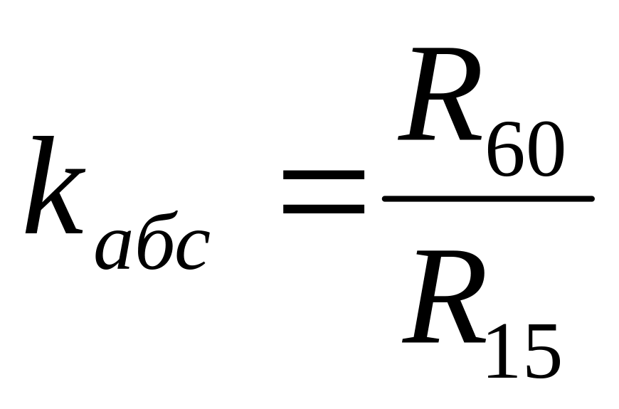 Поскольку ток абсорбции не зависит от степени увлажнения электроизоляционной конструкции, а его зависимость от температуры, размеров и конструкции изоляции примерно такая же, как и сквозного тока утечки через диэлектрик, то отношение электрического сопротивления R60, измеренного после затухания Iсм и Iабс, к значению R15, измеренного после затухания Iсм, характеризует степень увлажнения электрической изоляции и называется коэффициентом абсорбции: