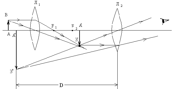 Объектив дает действительное увеличенное изображение предмета АВ ( рис. 2 ). Окуляр даёт увеличенное изображение АВ на расстоянии наилучшего зрения.