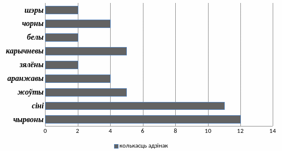 У ходзе праведзенай працы намі былі выяўлены 98 лексем са значэннем ‘каляровае найменне’. У аснову класіфікацыі фактычнага матэрыялу мы паклалі фізічную прыроду колеру, згодна з якой усе каляровыя найменні падзяляюцца на дзве групы: ахраматычныя і храматычныя колеры. Акрамя таго, намі былі выяўлены 6 агульных назваў паняцця ‘колер’.