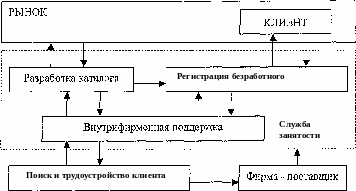 На основании исследований рынка потенциальных клиентов и предложений вакансий специалист (диспетчер оформитель) разрабатывает каталог предлагаемых вакансий и организаций; в большой фирме такую службу назвали бы отделом маркетинга. Каталог распространяется на рынке потенциальных клиентов. С клиентом, выбравшим вакансию, работает служба оформления. Специалисты, входящие в эту службу, принимают заказ, отправляют заявки, следят за их актуальностью и наконец вручают клиенту документы на трудоустройство.