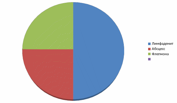 лимфаденит 50%,абсцесс 25%,флегмона 25%