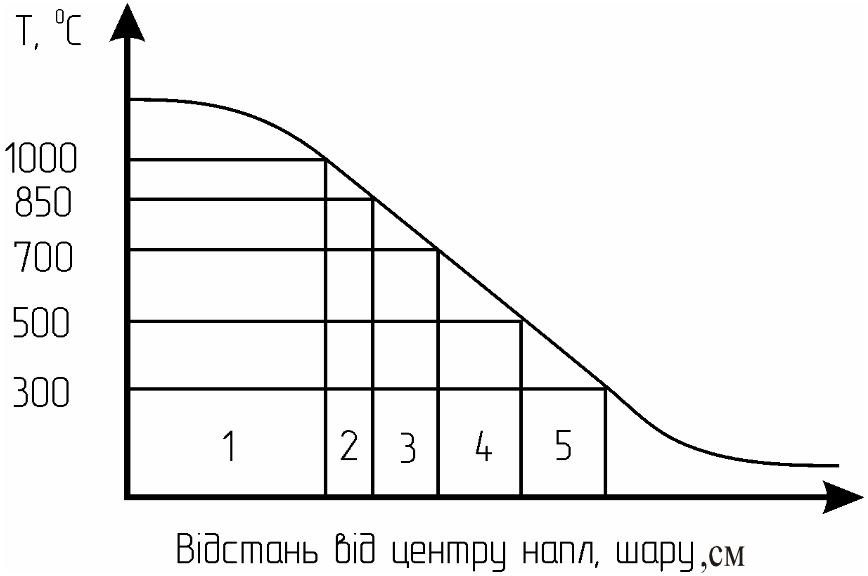 Розмір, структура і властивості ЗТВ визначаються розподілом у ній температур (рисунок 2.4). Ці фактори залежать як від термічного циклу наплавлення, так і від товщини металу, яка визначає швидкість охолодження. Відповідно до розподілу температур змінюються властивості ЗТВ для різних сталей по–різному.