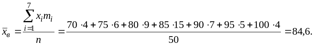 Мода – вариант вариационного ряда с наибольшей частотой. Мода М0 = 85, т.к. m4=15 – наибольшая частота.