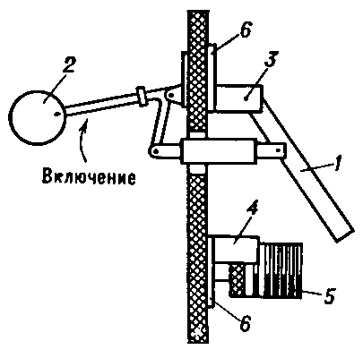 нож; 2 — рукоятка: 3 — ось; 4 —контактная стойка; 5 — дугогасительная камера; 6 — токоподводы.