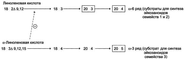 4. Эссенциальные жирные кислоты (ω-3 и ω-6) – незаменимые факторы питания липидной природы. Выделяют два семейства полиненасыщенных жирных кислот: омега-3 и омега-6. Жиры от каждой из этих семейств являются существенными, поскольку организм может преобразовать одну омегу-3 в другую омегу-3, например, но не может создать омегу-3 на пустом месте. Вместе весь комплекс полиненасыщенных жиров называется витамин F. В эту группу входит комплекс полиненасыщенных жирных кислот, которые принимают значительное участие в биологических процессах: